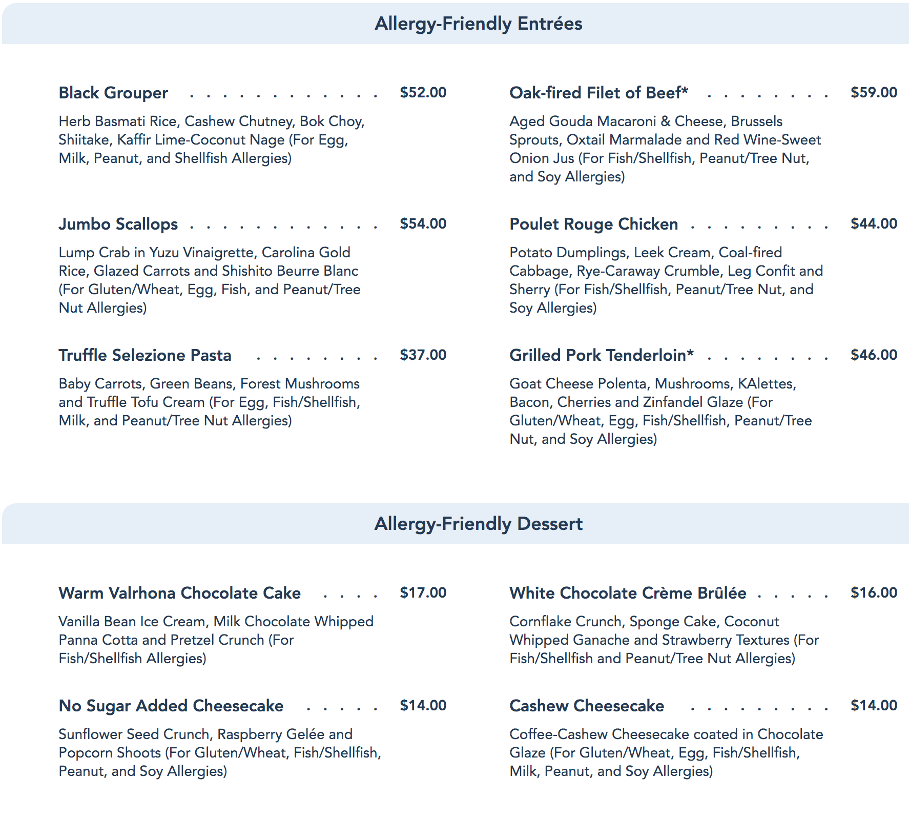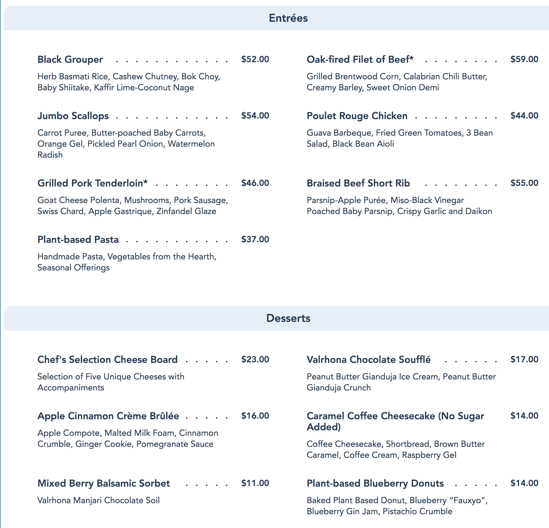 It offers sweeping views of the Magic Kingdom, upscale menu items, and handcrafted cocktails. This is one of those places that you take the family for a nice dinner or a romantic date night. The menu has changed a bit since we visited for the grand reopening in July. Some allergy-friendly items have been added a quality entree has changed quite a bit. Let’s take a look at the changes!