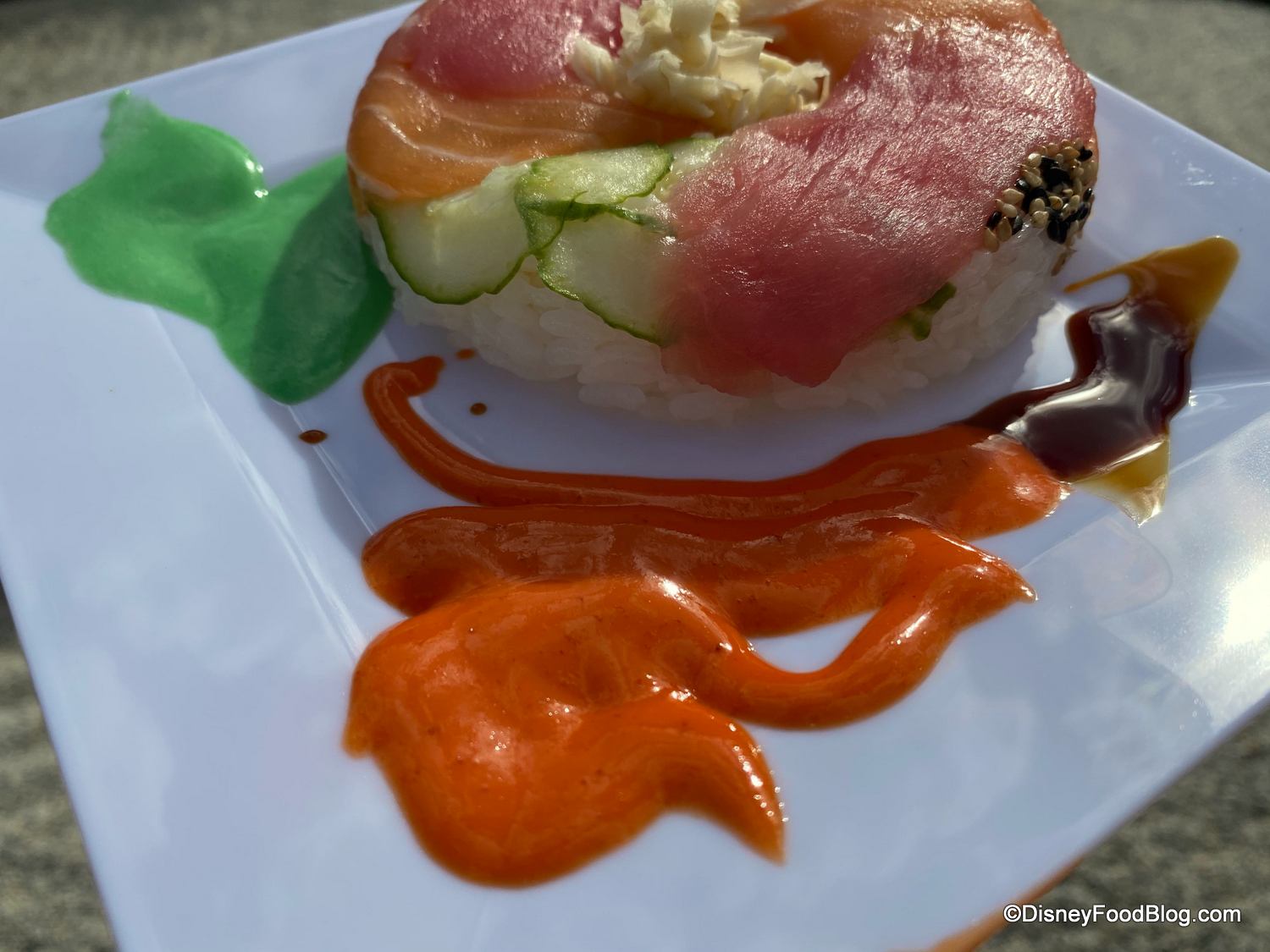 We’ve been making our way through World Showcase and got a taste of Remy’s Signature ratatouille and a SPICY stuffed pepper in Mexico. Our next stop is the Goshiki Food Studio located in the Japan Pavilion. Save room for sushi because this is where you can stuff yourself with rice and soy sauce!