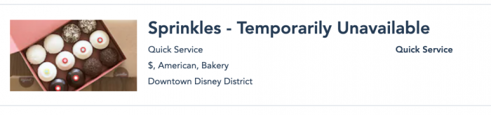 We noticed today that Sprinkles in Downtown Disney is currently closed. Checking Disneyland’s website, it lists the location as “Temporarily Unavailable.”