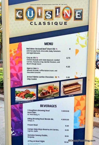 To help quench your thirst, you’ll find several drink options at Cusine Classique. Two of them are new this year — the 3 Daughters Brewing Rosé Hard Cider and the 81Bay Brewing Rosé Blonde Ale. Both of these beverages hail from Florida and cost $4.50 for a 6 oz and $8.50 for a 12 oz. Besides these new choices, you can find the returning Frozen Rosé for $6.50. All three of these options are available in the $10.50 A Play on Rosé Flight.