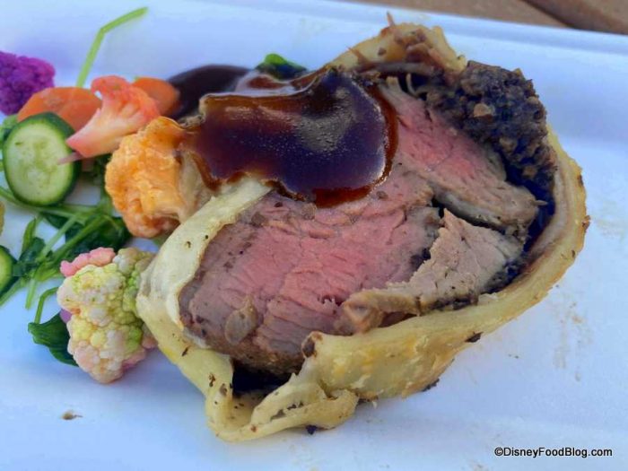 As is the case with the American Adventure booth across all of EPCOT’s festivals, you’ll find some familiar savory dishes, like their Beef Wellington for $8.25. (We won’t tell them this dish originated in England if you don’t! Technically, so did all of America!) It’s served with Mushroom Duxelle, Prosciutto, and Puff Pastry with Red Wine Demi-Glace and Fennel Cream. This was a winner for us in the past, but how does this year’s version compare?
