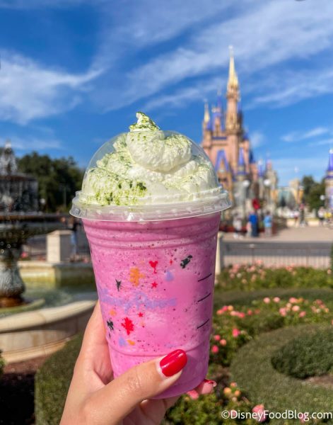 When we ordered our own Maleficent Frappuccino at Main Street Bakery, we had to make some adjustments. Blueberry juice wasn’t available, so we asked for blueberries or blackberries to be added instead. And it still turned out pretty beautiful and perfect to impress your Instagram followers!