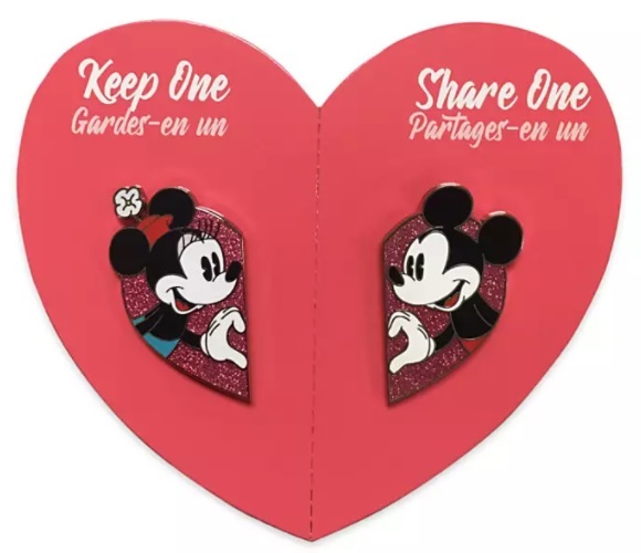 Finally, we didn’t spot Disney’s last new Valentine’s Day item at the Disney Store, but it IS on shopDisney, and that’s a Valentine’s Day pin set! There’s a Minnie pin and a Mickey pin, and when you put them together, they make a heart! Aww! This pin set costs $14.99.
