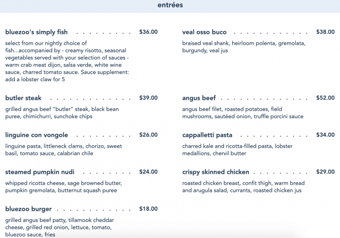 Additions include a Crispy Skinned Chicken that includes Roasted Chicken Breast, Confit Thigh, Warm Bread, Arugula Salad, Currants, and Roasted Chicken Jus for $29. Plus, for burger lovers, there’s the bluezoo Burger that comes with a Grilled Angus Beef Patty, Tillamook Cheddar Cheese, Grilled Red Onion, Lettuce, Tomato, bluezoo Sauce, and Fries for $18.