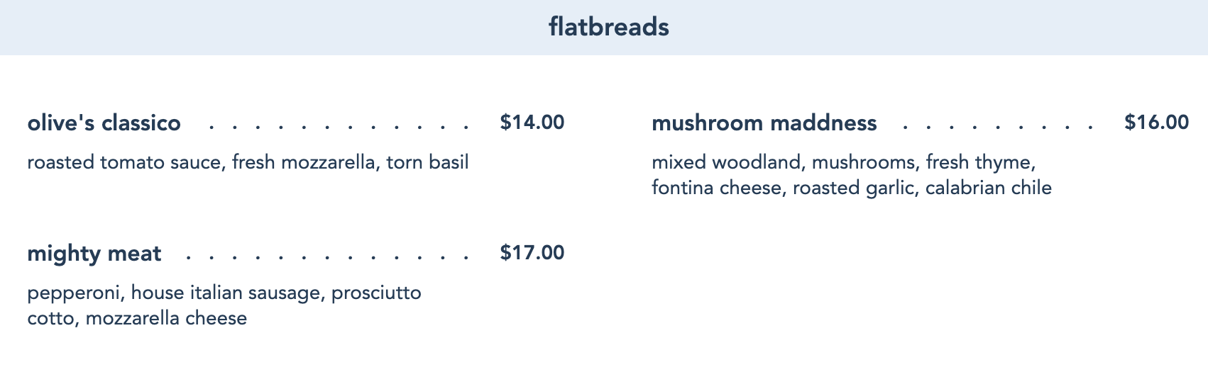 There are also a handful of flatbreads to check out! Mushroom Maddness includes Mixed Woodland Mushrooms, Fresh Thyme, Fontina Cheese, Roasted Garlic, and Calabrian Chile for $16. And, there’s the Mighty Meat flatbread with Pepperoni, House Italian Sausage, Prosciutto Cotto, and Mozzarella Cheese for $17.