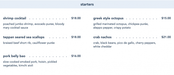 Todd English’s bluezoo offers innovative dishes, often featuring seafood! Now, let’s see what changes have been made to the Starters portion of the dinner menu!