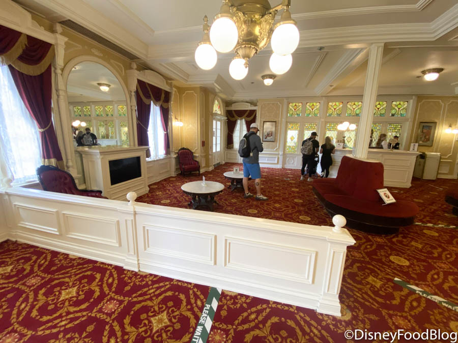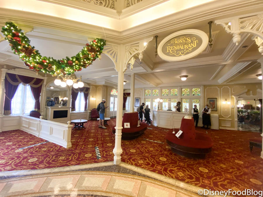 You can’t miss the sign out front of the restaurant featuring Tony himself! When you walk in, there is grand red carpet with gold accents. To comply with health and safety procedures in the parks, there are distancing markers leading up to the check-in desk.