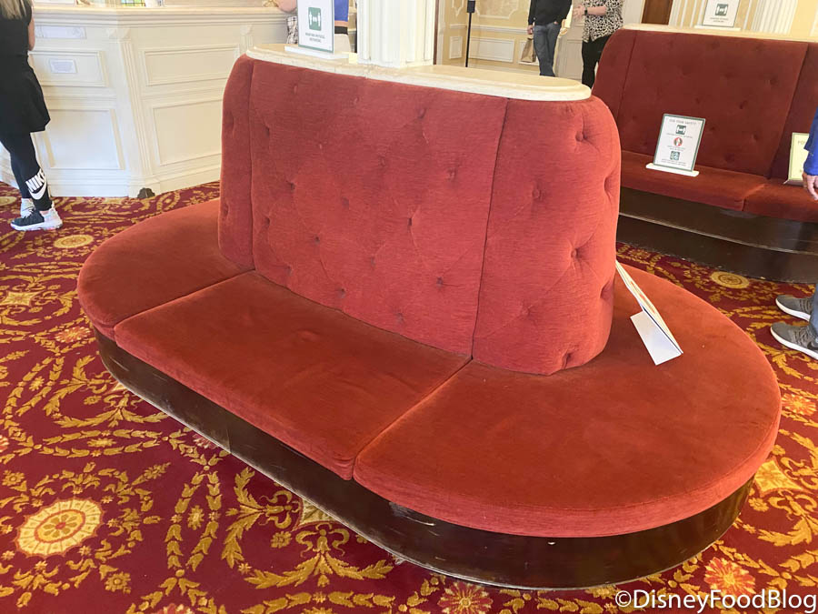 While you wait for your table, there are a few places to sit. Sections of the sofas are blocked off so that guests can socially distance. These sofas are somewhat unique and fun. They remind us of seating you’d find while waiting to get into an old-style theater, which makes sense — Tony’s is next door to the Town Square Theater! In fact, both locations share the same carpeting and wood paneling in their lobby areas.
