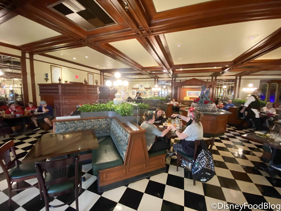 There are three main dining areas in the restaurant. The indoor dining room, the one with that fountain we showed you, features a classic black and white checkered floor with browns and deep greens as part of the color scheme.