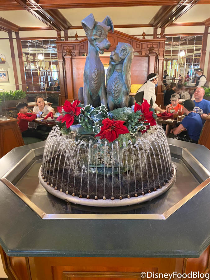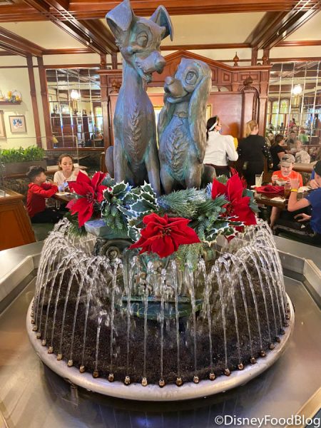 When we received our text that our table was ready, we were taken into the restaurant where we passed the stunning Lady and the Tramp Fountain!