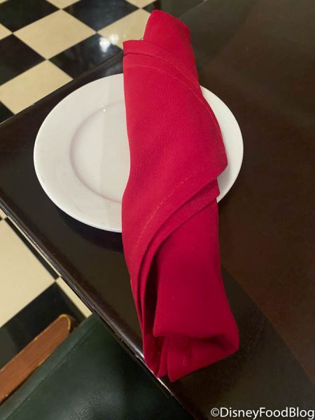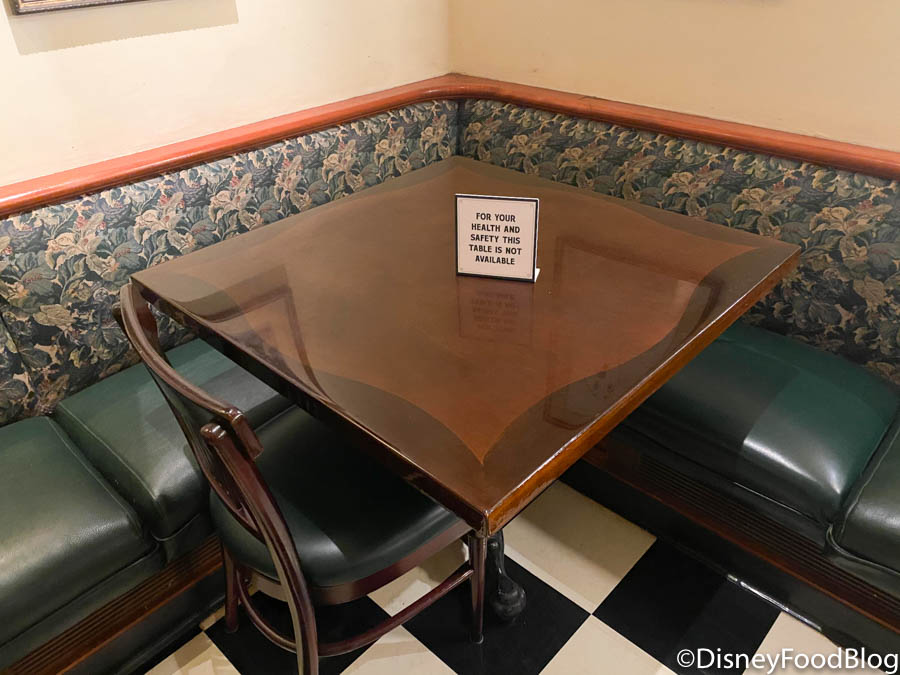 We were seated in the main indoor dining room, but as we were walking to our table, we noticed several that were blocked off as unavailable. We’ve seen this table sign at restaurants all over Disney World, so it wasn’t much of a surprise to see them here, too.