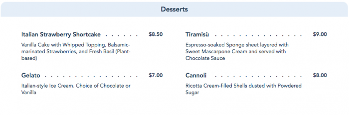 Sticking with the Italian theme, the desserts include tiramisu, cannolis, gelato, and a plant-based Italian strawberry shortcake.