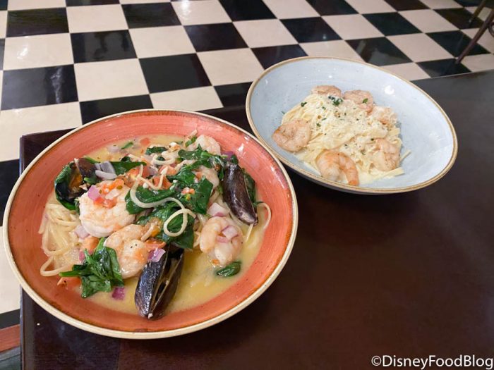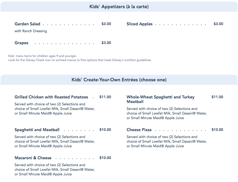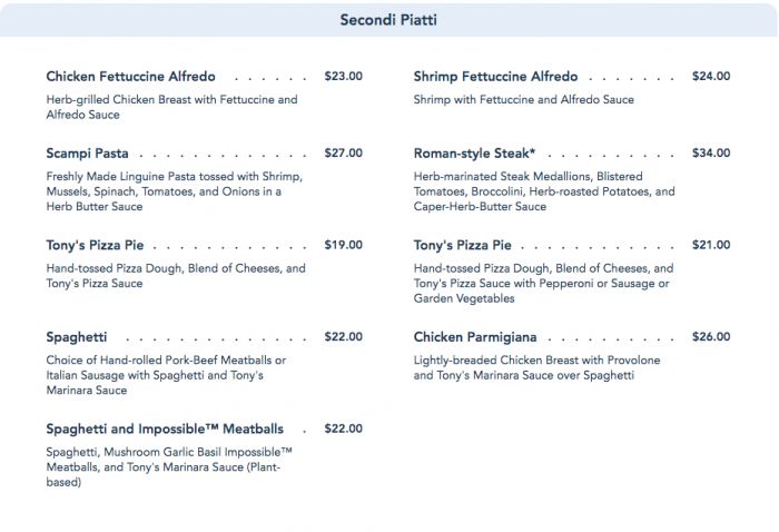 On the entree menu, you’ll find familiar favorites like chicken parmesan, fettuccini alfredo, pizza, and spaghetti and meatballs. That means you and your loved ones can recreate that iconic spaghetti scene from Lady and the Tramp! (C’mon, you know you were thinking it! 😊)