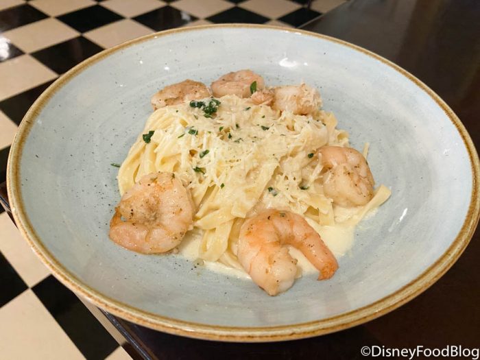 Because it has been a while since we’ve dined here, we tried not one, but two of the entrees! We decided to go with the Scampi Pasta and the Shrimp Fettuccini Alfredo.