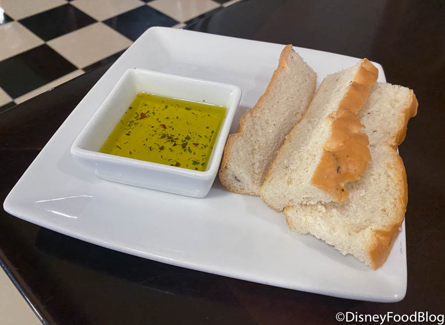 As soon as we sat down, bread was brought to our table. Tony’s serves Focaccia Bread with Herbed Olive Oil for dipping. The bread was fresh and paired nicely with the oil, but there wasn’t much to it. The olive oil is a nice change from the butter served at most locations but is a fairly common accompaniment at most Disney World Italian eateries.