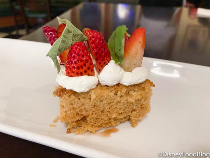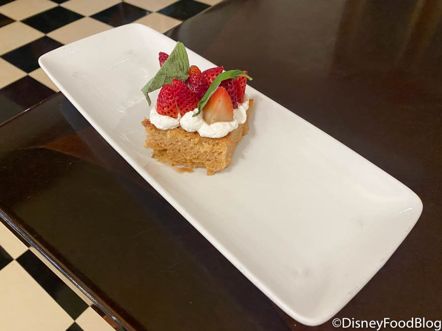 So the appetizer was a bit disappointing, and neither of the entrees dazzled us, so there was only one hope left: the dessert! We decided to try the Italian Strawberry Shortcake. This plant-based dessert sounded promising because it is made of Vanilla Cake with Whipped Topping, Balsamic-marinated Strawberries, and Fresh Basil.