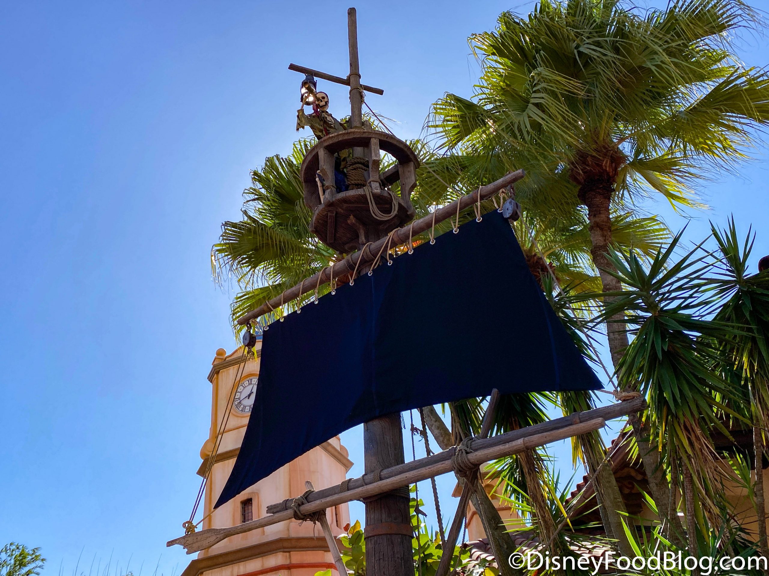We have been keeping a close eye on the Pirate’s flag for almost two months. The Pirates flag for the attraction went missing and was replaced by a solid black flag. A Cast Member told us to be on the lookout for a replacement. And that replacement has officially arrived.