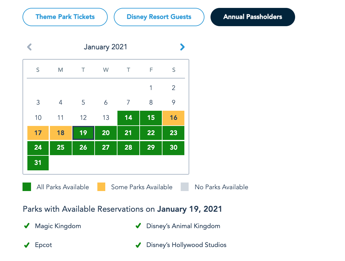 Current Disney Park Pass Reservation Availability the Week of January 17th