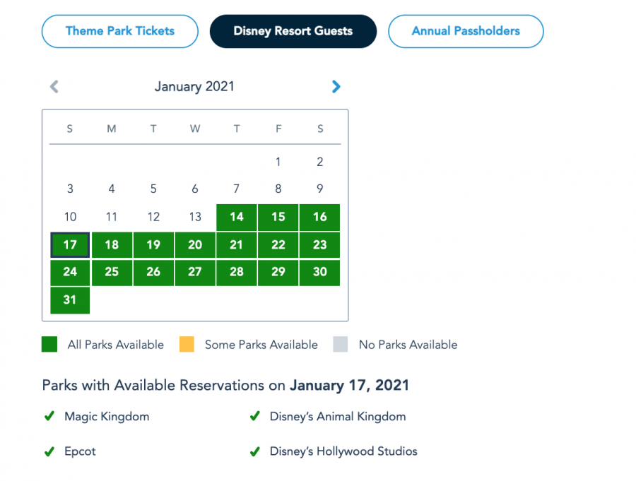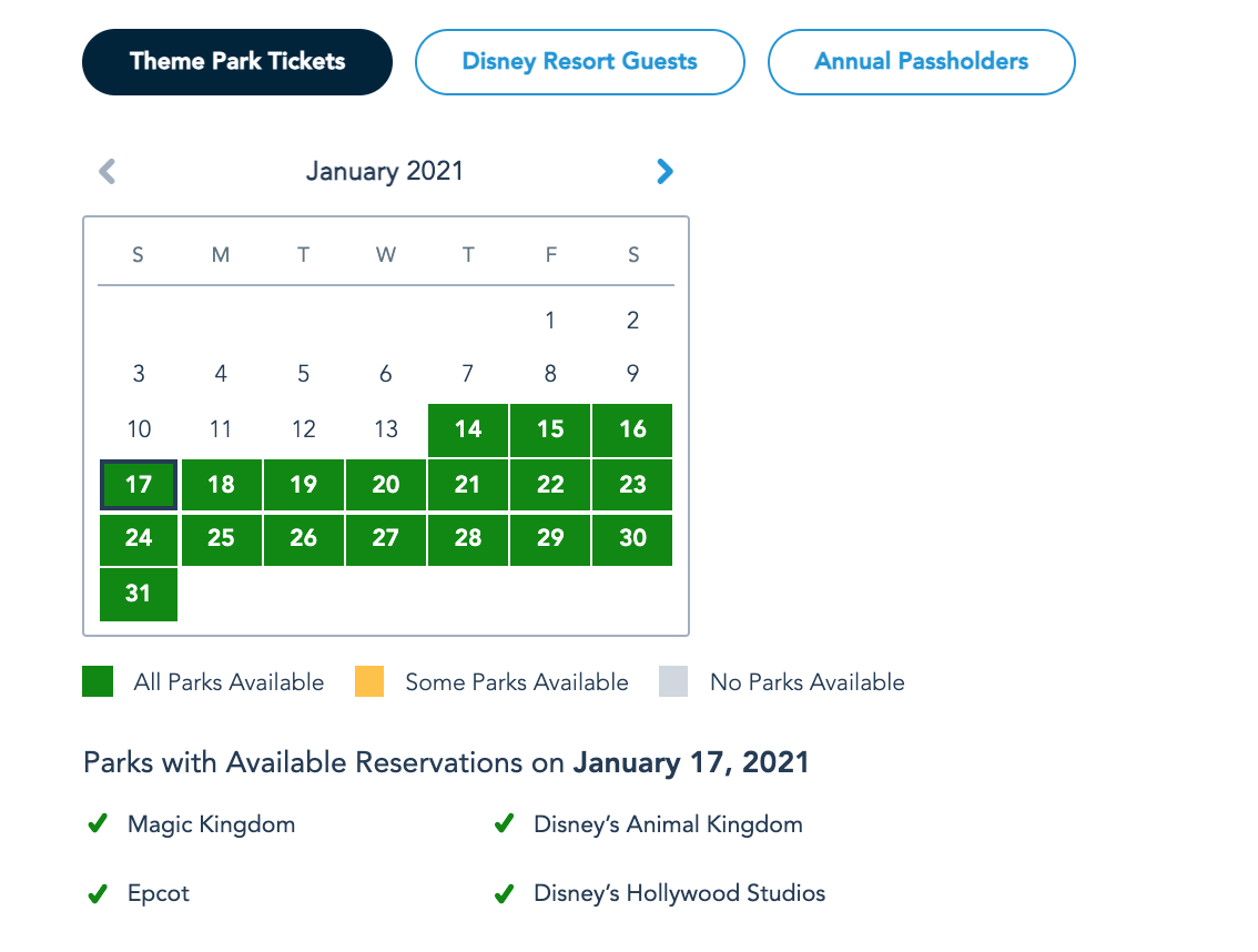 Theme Park Ticket Guest Park Pass Reservation availability for January 17th as of January 14th © Disney