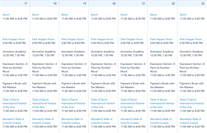 Next week, EPCOT will be open daily from 11AM-8PM. Park hopping hours at EPCOT will be from 2PM-8PM. If you are looking to visit the Taste of EPCOT International Festival of the Arts, the festival hours will be the same as the park hours, from 11AM-8PM daily. Disney’s calendar also now includes times for various festival activities, like the Animation Academy (12:30 and 1:30PM daily) and the hours you can participate in Expression Section: A Paint by Number Mural (daily from 11AM-5PM).