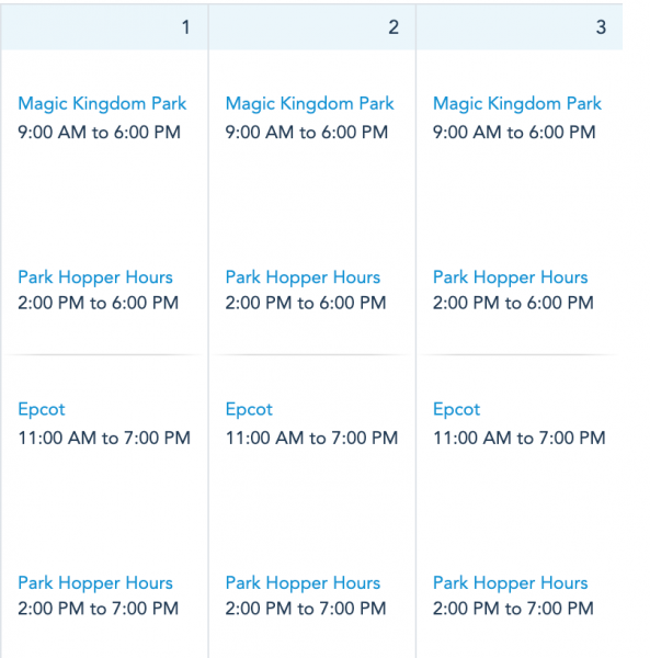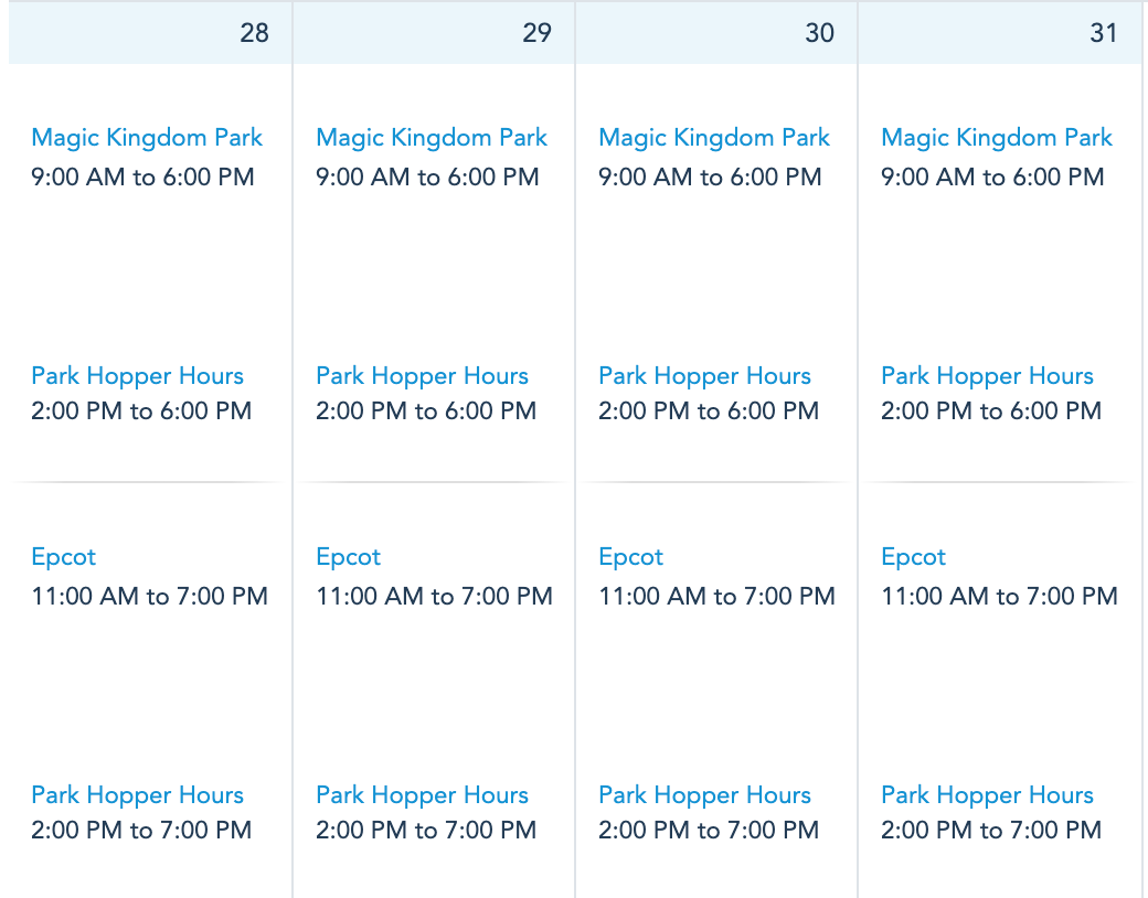 On these days, Magic Kingdom will continue to be open from 9AM to 6PM and EPCOT will be open from 11AM to 7PM.