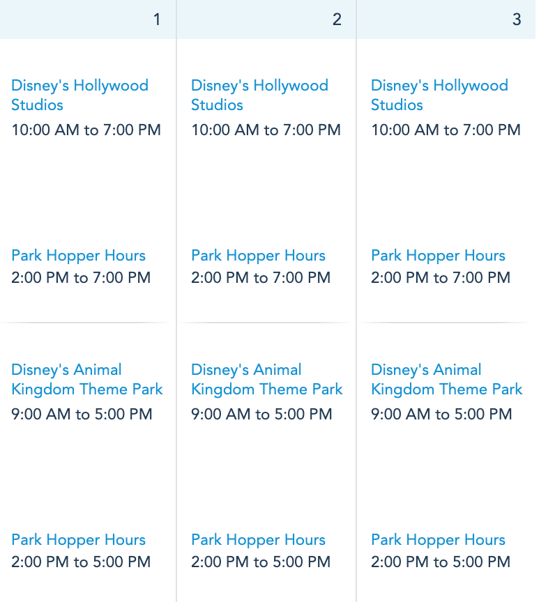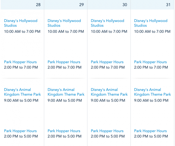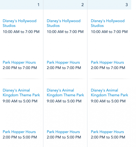Hollywood Studios will be open from 10AM to 7PM and Animal Kingdom will be open from 9AM to 5PM.