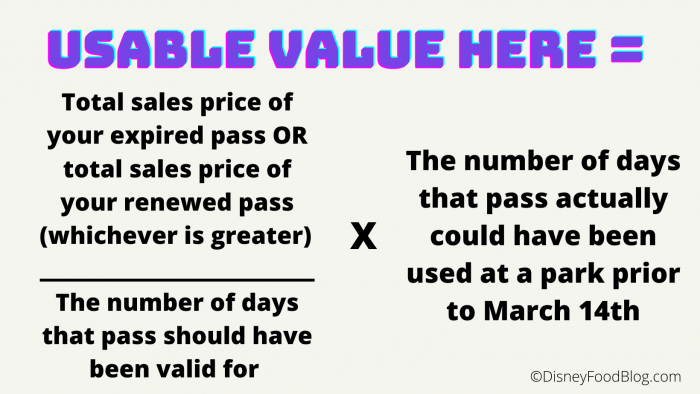 In this case, usable value equals the sales price of the expired Passport or the renewed Passport (whichever is greater) / total number of days you should have been able to access the parks under that expired Passport x the number of days the expired Passport could have actually been used to visit a park per its terms prior to the closures on March 14, 2020.