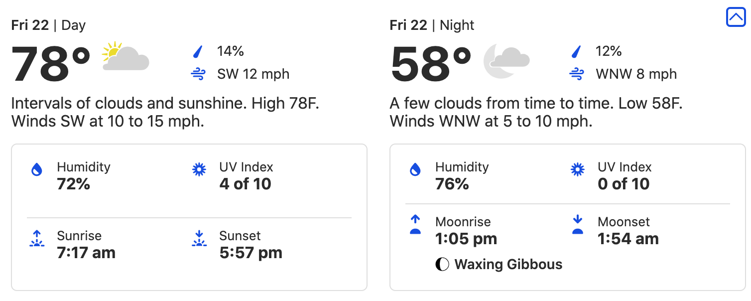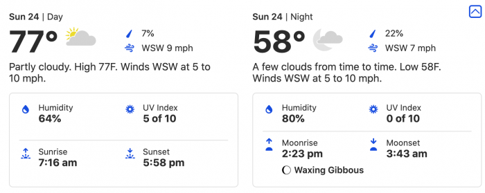 Here, we’re looking at a 74-degree high and a 55-degree low.