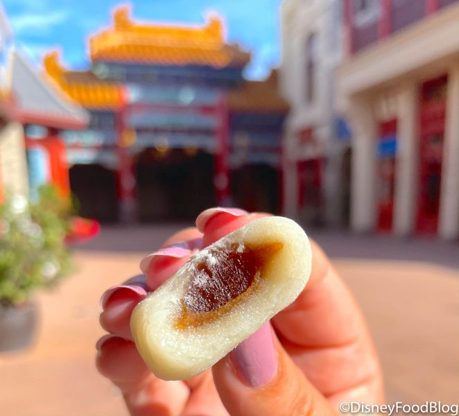 As we continued around the China Pavilion, we popped into the House of Good Fortune to check out all the merchandise and snacks inside. We noticed that there were little Bubble Milk Tea Mochi goodies out on the shelves for $5.95, and (of course) we had to try them!