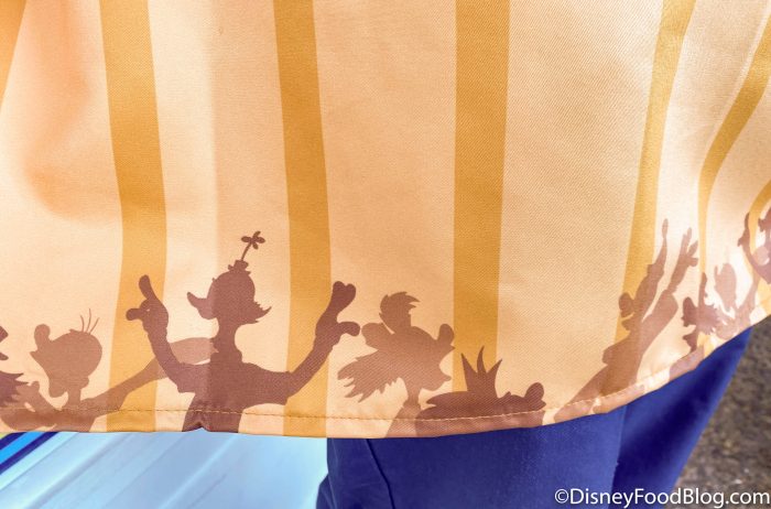 The costume consists of a white button-down shirt with a blue collar and some other blue accents, as well as blue pants. There’s also a colorful apron on top with some beautiful details on it, including a silhouette of Dumbo and Timothy Q. Mouse.