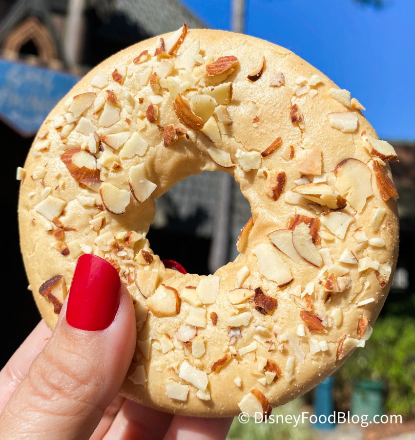 A new cookie has arrived at one of our favorite bakeries in EPCOT! Kringla is home to the classic School Bread treat and now it’s home to the new Almond Ring Cookie! The treat is a sweet, dense cookie covered in sliced chopped almonds.