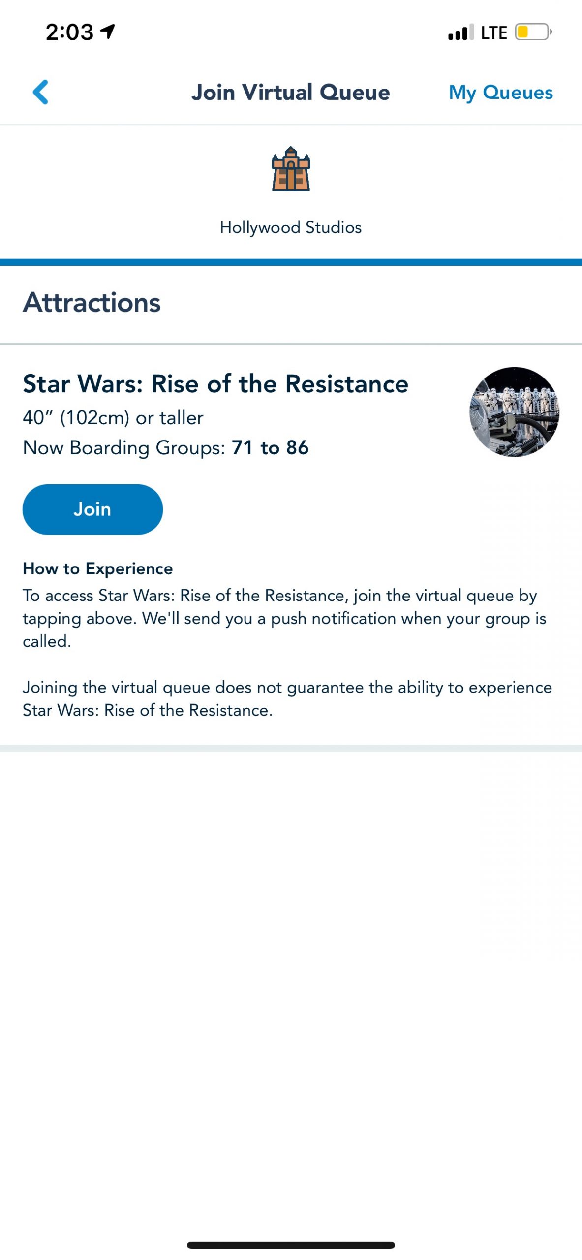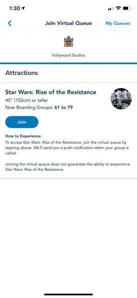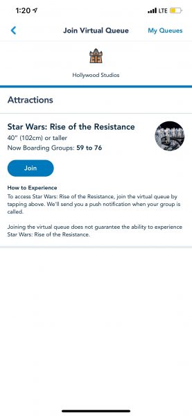 Here’s how it works: two times during each day (those times are currently 7AM and 1PM), guests can log in to the My Disney Experience app and attempt to join the virtual queue for Rise of the Resistance. At 7AM, guests can log in from anywhere, as long as they have a park pass reservation for Hollywood Studios. At 1PM, guests must have a park pass reservation AND physically be in the park at the time.