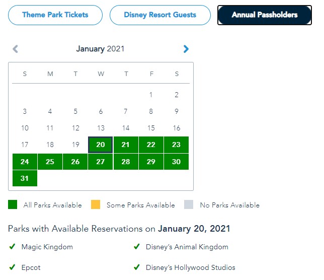 Current Disney Park Pass Reservation Availability the Week of January 24th