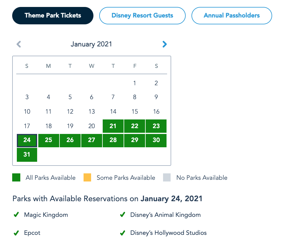 Park Pass Reservation availability for Theme Park Ticket Guests for the week of January 24th as of January 21st © Disney