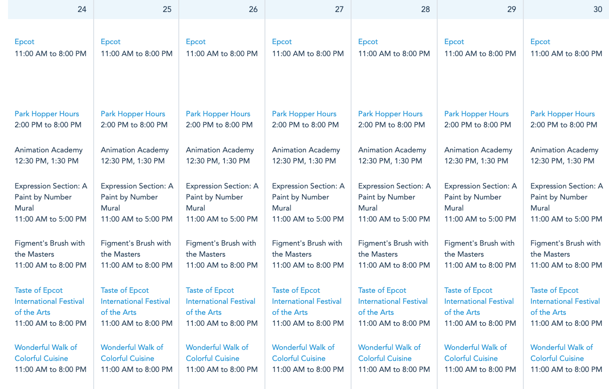 For the week of January 24th, EPCOT will be open daily from 11AM-8PM, with Park Hopping available from 2PM-8PM daily. The Taste of EPCOT International Festival of the Arts will also be open daily from 11AM-8PM, with various performances and activities taking place throughout the day!