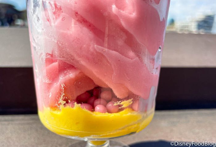 Well, this just might be the most adorable treat we’ve seen all week. The cup features Watermelon Dole Whip with strawberry white chocolate crunch pearls and pineapple mousse topped with chocolate Minnie ears.