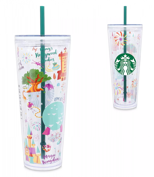 We spotted two new Starbucks Disney tumblers online this week, both designed to match Disney parks. The Walt Disney World Starbucks Tumbler has icons from the resort’s parks and is $24.99.