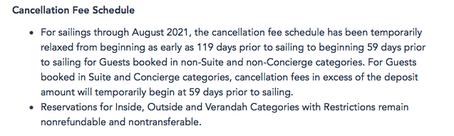 Additionally, Disney has temporarily relaxed their cancellation fee schedule for sailings through August 2021. You can see the details below.