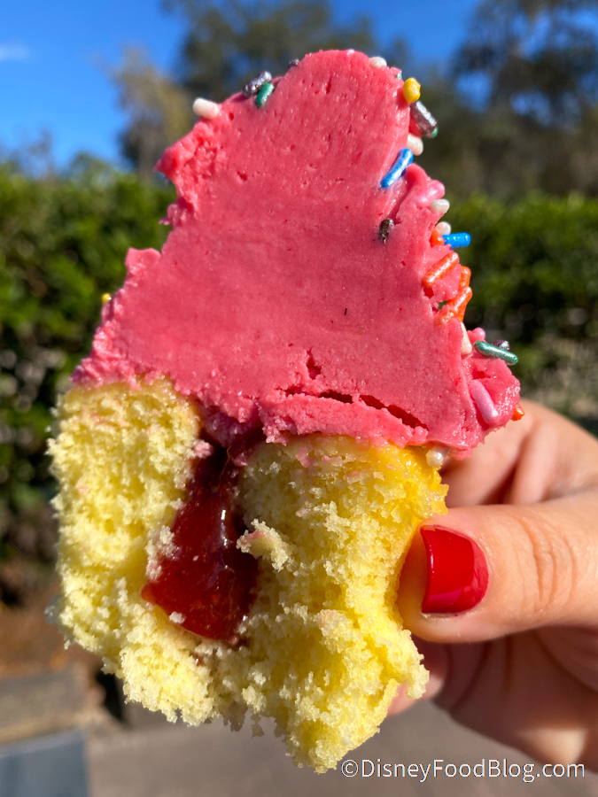 Well, we found yet ANOTHER new cupcake at Disney World today — the Specialty Cupcake at P & J’s Southern Takeout. It’s a Vanilla Cupcake with Raspberry Filling and Strawberry Buttercream, topped with rainbow sprinkles. And despite its uninspired name, it’s still a lot of fun to look at!