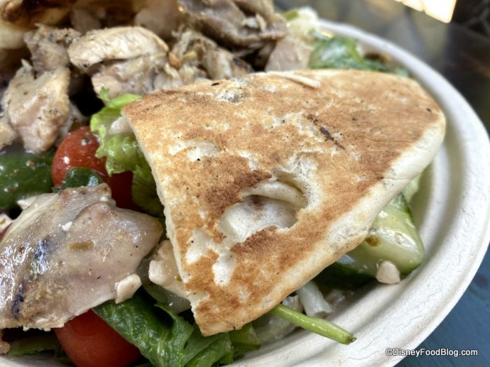 You’ll also notice on Mobile Order that there is an option to have the dressing included on the side, if you prefer; however, we ordered it as-is (with the dressing mixed in) and with chicken. A few pita triangles are also plated with the salad.