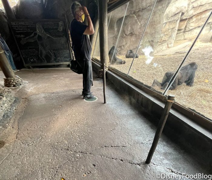 In the gorilla viewing area, there are 4 green dots for parties to stand on. Every minute or so, a Cast Member will tell parties to take a step to their right onto the next green dot. This is the same process as before the construction, so nothing has changed in the viewing areas that are open!