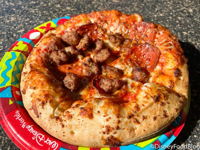 So, there are two “flavors,” if you will, of Disney World pizza: puffy, round, single-serving pizzas (like you’ll find here) or flatbreads (like we recently tried over at Pinocchio Village Haus in Magic Kingdom). Both aren’t typically the best pizza out there, but, of the two, the puffy pizzas tend to be our least favorite. In the past, we’ve found them to be doughy with a disproportionate amount of toppings. Often the cheese and sauce are afterthoughts, getting lost in the massive pile of dough. They’re comparable to fast food pizzas you might get at a 7-11 or other grab and go type location.