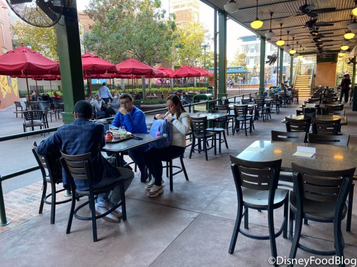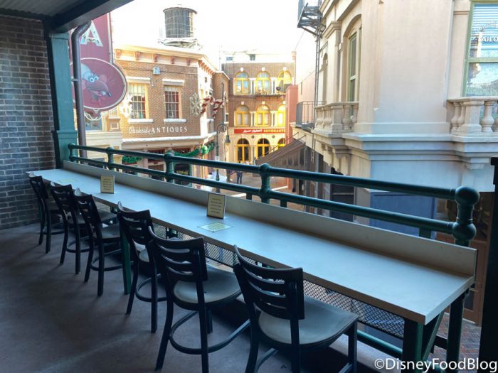 Our favorite place to sit at this restaurant is on the second-floor patio. Not only is it covered, but it gives you great views of the Muppet Courtyard!