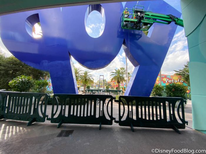 At Disney’s Pop Century Resort, the large POP sign outside the lobby was undergoing a minor touch-up.