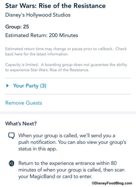 But, when we got a Rise of the Resistance Boarding Group this morning, we noticed that the My Disney Experience app showed us something a bit different. Here’s a look at the page we got once we were assigned a Boarding Group. It specified that we were placed in Group 25 and our estimated return was 200 minutes. At the bottom you’ll see a “What’s Next?” portion…