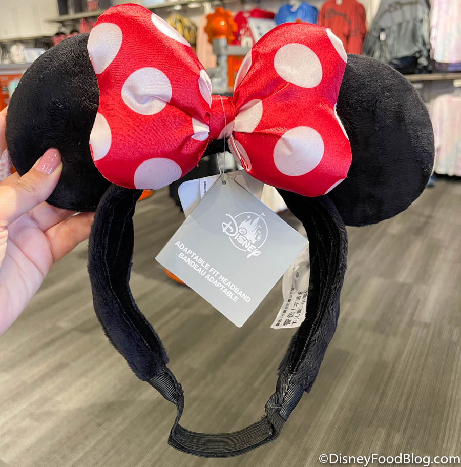 First up are these Minnie Mouse ears with a classic red polka-dotted bow. The fabric is the same soft material as the original ears. We’re already picturing how many Minnie-inspired outfits could match these!