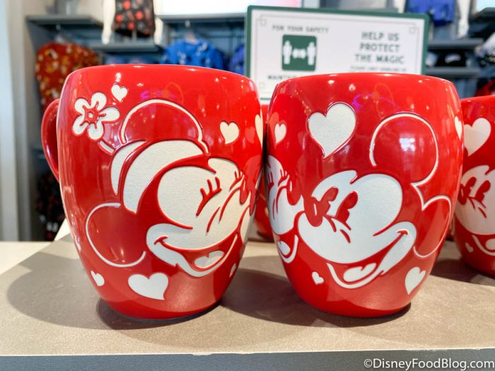 In Tomorrowland, we popped into Star Traders to find the Mickey and Minnie Valentine’s Day mugs! We’ve seen them at Springs before, but now they’re in the parks, too.