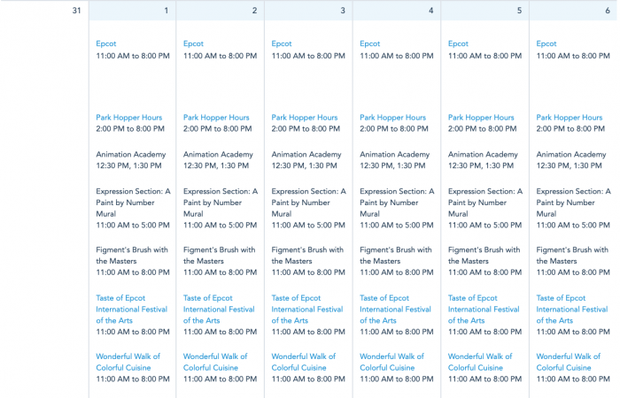 For the week of January 31st, EPCOT will be open daily from 11AM-8PM. The Taste of EPCOT International Festival of the Arts will also be open daily from 11AM-8PM, with various festival events and activities happening throughout the day.