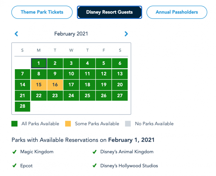 Disney Resort Guests currently have full Park Pass Reservation availability at all four theme parks from February 1st through February 6th.