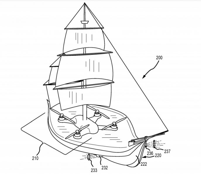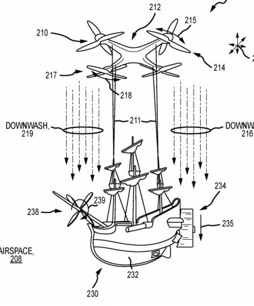 This particular patent shows imagery of what would be a flying pirate ship, just like the one from Peter Pan! Now, interestingly enough, we’ve seen a patent for a drone-powered flying pirate ship before, but that one looked a little bit different.